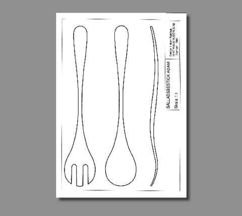 Enkelt salladsbestick i ädelträ. Ursprungligen ritat för Rolf Carlsson och tänkt att tillverkas genom enbart kontursågning i två dimensioner. Design: Håkan Rudérus 1994.