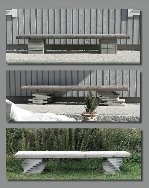 Bänkskiva i massiv lärk 2500x400x100 mm (LBH). Underrede betongplattor 300x300x40 mm (LBH), som kan arrangeras på olika sätt för att få lite variation.